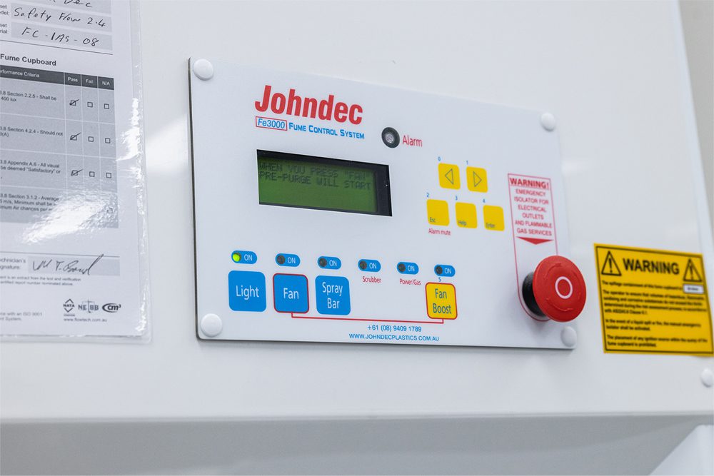 Johndec Safetyflow non-hazardous aerodynamic fume cupboards meet exacting standards and recommendations for safety and containment in the laboratory. The Safetyflow Fume Cupboards comply with the Australian Standards 2243.8 and are wholly manufactured in Australia.